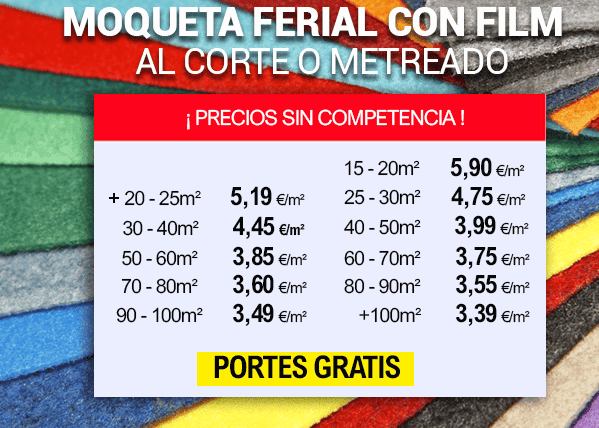 Moquetas feriales 100% polipropileno tintado en masa con film protector al corte. Disponibles por metros. Perfectas para ferias, exposiciones y eventos. ¡Pregunta por nuestro servicio de serigrafía y digitalización!
