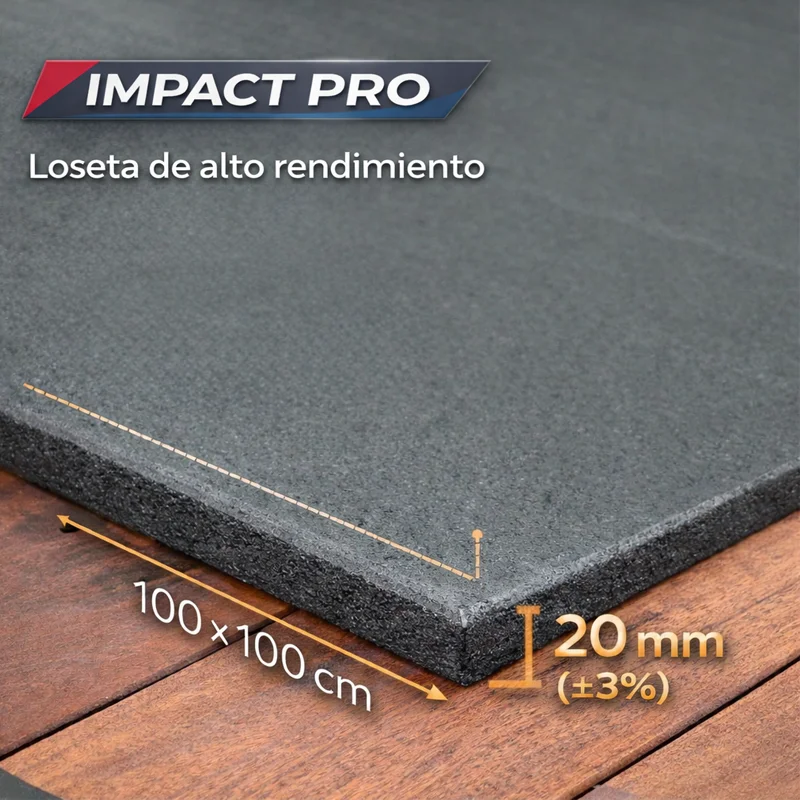 La loseta de caucho IMPACT PRO es un suelo técnico de última generación diseñado para gimnasios, boxes de CrossFit y zonas de entrenamiento intensivo. Supone una evolución frente a las losetas convencionales de cauc La loseta de caucho IMPACT PRO es un suelo técnico de última generación diseñado para gimnasios, boxes de CrossFit y zonas de entrenamiento intensivo. Supone una evolución frente a las losetas convencionales de caucho reciclado, ofreciendo mayor durabilidad, excelente absorción de impactos y un aislamiento acústico superior. Su estructura combina caucho SBR reciclado de alta calidad con una capa superior de TPE no reciclado antirayaduras, proporcionando una superficie extremadamente resistente, estable y fácil de limpiar incluso en entrenamientos exigentes. Fabricada mediante Cold Mold Process (moldeo en frío) y con aglutinante de poliuretano MDI, la loseta presenta una estructura compacta de alta densidad que mejora su resistencia y vida útil frente a otros suelos de caucho. Cumple normativa REACH y cuenta con test VOC ampliado (+100 compuestos), garantizando un material seguro y no tóxico para uso en interiores.Leer mas...MEDIDAS/LOGÍSTICA