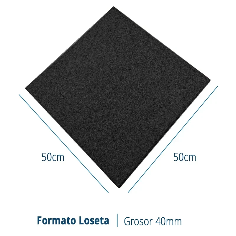 Las losetas de caucho negro de 50x50cm y 40mm de grosor para Suelos infantiles son ANTIDESLIZANTES destacan por ser una opción ideal para parques Infantiles independientemente de que sean exteriores o Las losetas de caucho negro de 50x50cm y 40mm de grosor para Suelos infantiles son ANTIDESLIZANTES destacan por ser una opción ideal para parques Infantiles independientemente de que sean exteriores o interiores. Estas losetas de densidad estándar son adecuadas para colocar en zonas donde sea necesaria la amortiguación y la absorción de impactos, flexibilidad y propiedades antideslizantes que previenen las caídas. Estas losetas están preparadas para lugares de alto tránsito, gracias a su comodidad, movilidad y resistencia. Además, destacan también por ser un material de fácil limpieza, instalación y mantenimiento, siendo un material versátil y apto para cualquier espacio con altas exigencias.Leer mas...MEDIDAS/LOGÍSTICA
