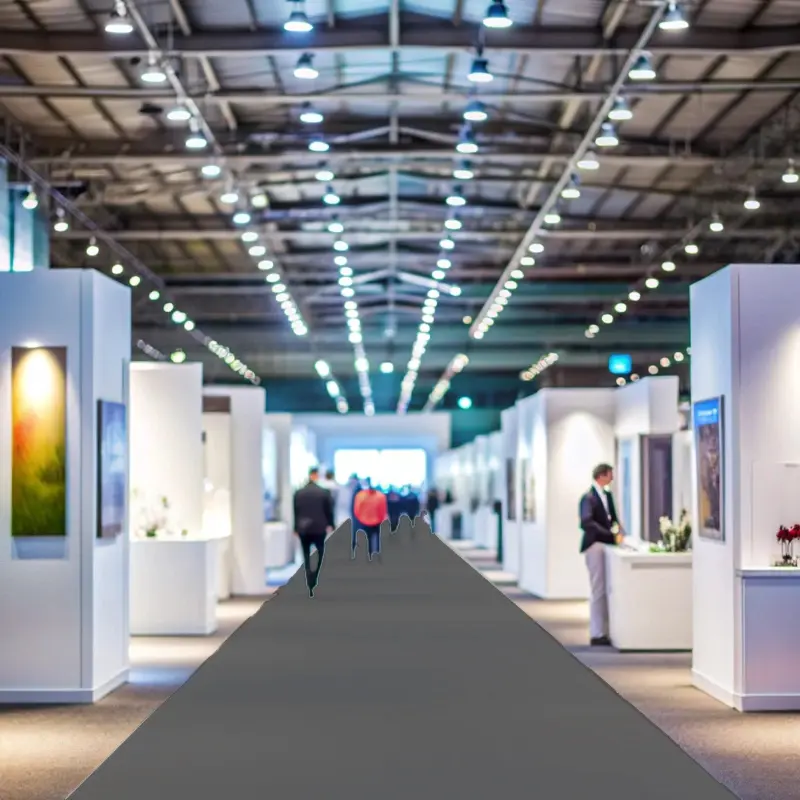 Moquetas feriales 100% polipropileno tintado en masa. Disponibles por metros, en bobinas completas, con y sin film protector. Perfectas para ferias, exposiciones y eventos. ¡Pregunta por nuestro servicio de serigrafía y digitalización!