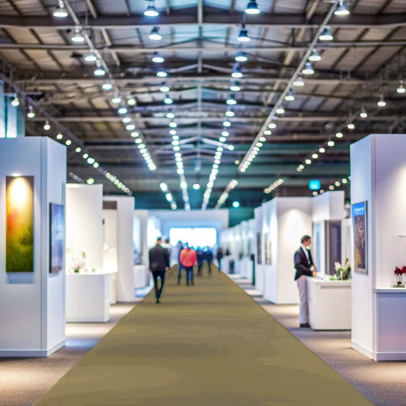 Moquetas feriales 100% polipropileno tintado en masa. Disponibles por metros, en bobinas completas, con y sin film protector. Perfectas para ferias, exposiciones y eventos. ¡Pregunta por nuestro servicio de serigrafía y digitalización!