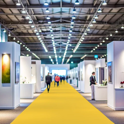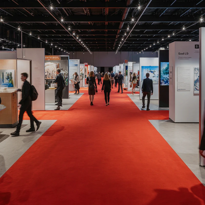 Moquetas feriales 100% polipropileno tintado en masa. Disponibles por metros, en bobinas completas, con y sin film protector. Perfectas para ferias, exposiciones y eventos. ¡Pregunta por nuestro servicio de serigrafía y digitalización!