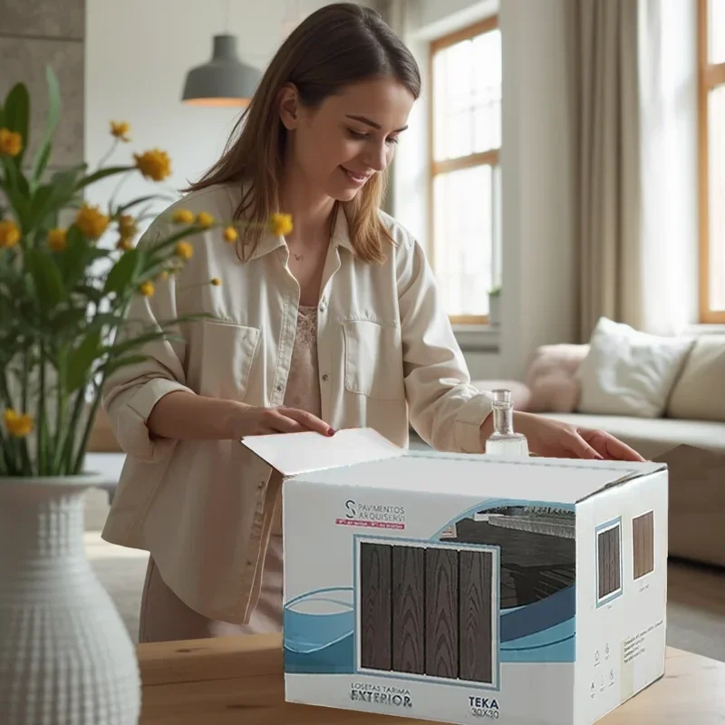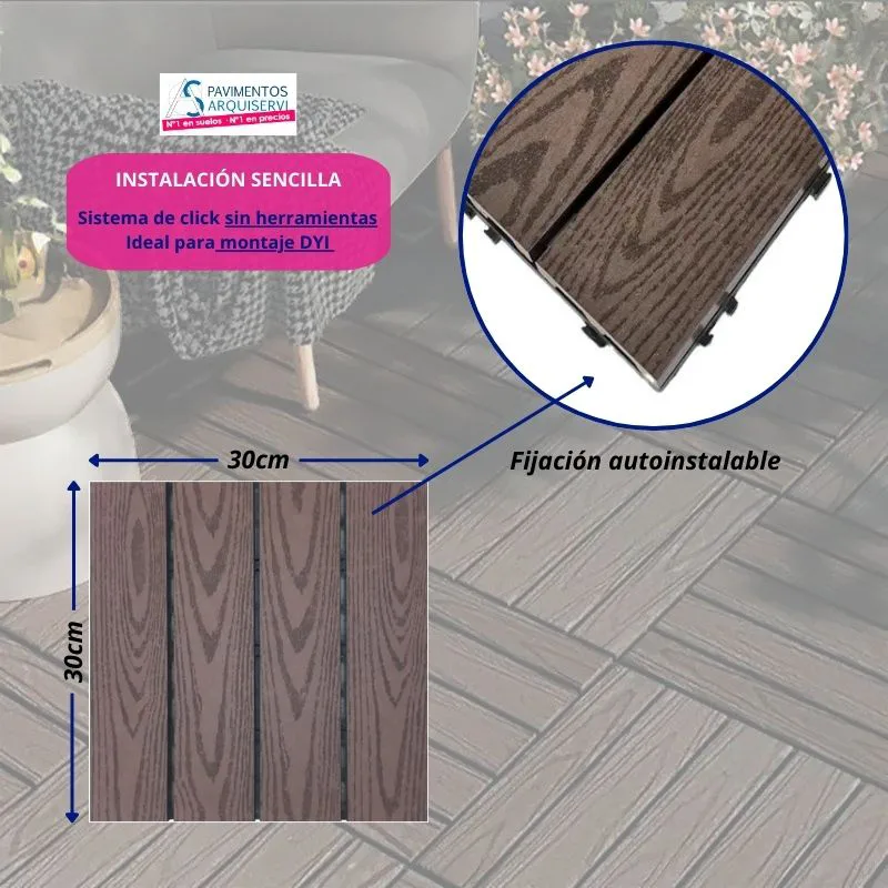 Baldosas de madera composite, sintéticas para exterior. Antideslizante con drenaje. Su formato de losetas de 30 x 30 hace los espacios más grandes. Estéticamente únicas con superficie veteada textura y color con aspe Baldosas de madera composite, sintéticas para exterior. Antideslizante con drenaje. Su formato de losetas de 30 x 30 hace los espacios más grandes. Estéticamente únicas con superficie veteada textura y color con aspecto 100% natural. Montaje rápido y fácil. Resistentes, duraderas y económicas. Cambia y disfruta de tu exterior en solo horas.Transforma tu espacio exterior con las losetas de composite Arquitech Autoinstalables, una solución innovadora que combina diseño, durabilidad y facilidad de instalación. Estas losetas están diseñadas para que cualquier persona pueda instalarlas sin necesidad de obras ni herramientas. Son Autoinstalables gracias a su sistema de enganche, simplemente conecta las losetas entre sí como si fueran un puzzle. No necesitas pegamento, clavos ni herramientas, además son resistentes gracias a su fabricación en composite de alta calidad, son impermeables, antideslizantes y resistentes al desgaste, lo que las hace ideales para patios, terrazas y balcones, dandonos un toque moderno, además estan disponibles en diversos colores y acabados que imitan a la madera, aportando un toque moderno y elegante a cualquier espacio. Tienen una base plástica, de fácil Instalación, no se agrieta ni se astilla, antideslizante, de fácil mantenimiento, antialérgica e higiénica de alta calidad y resistencia, de gran durabilidad y protección ante las inclemencias y la intemperie, totalmente ecológicas y 100% reciclable sin productos tóxicos ni formaldehidos. ¿A que son perfectas? Con las losetas Arquitech, renovar tu espacio exterior nunca fue tan sencillo ni rápido. ¡Engánchalas y disfruta de un suelo impecable!Leer mas...MEDIDAS/LOGÍSTICA