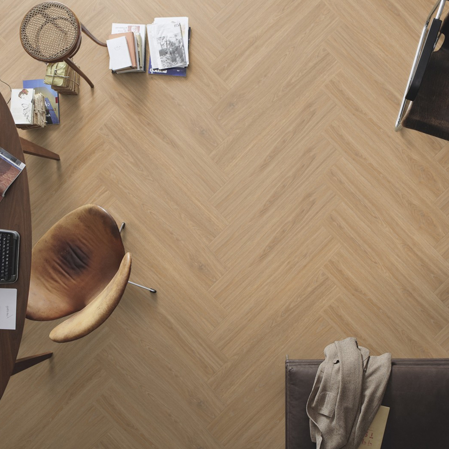 La espiga de la Colección LS350 de suelos laminados, interpretada y totalmente modernizada: el patrón de colocación tradicional confiere un aspecto noble, elegante y muy variado; además, al tratarse de un suelo laminado, también es muy fácil de cuidar y resistente. La estructura sincronizada de alta calidad y un microbisel fino alrededor de cada tablón proporcionan al suelo un aspecto muy auténtico y natural. La superficie Diamond Pro especial es resistente a los arañazos, insensible a la luz e incluso resistente a los productos químicos. Y otro valor añadido: es facilísimo de colocar gracias al sistema de colocación patentado UniZip.