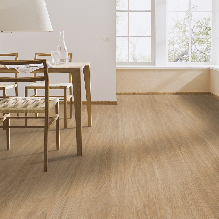 El MeisterDesign. laminate LD 250 en formato compacto de tablón corto (1287 x 220 mm) posee una estructura del producto especialmente alta y estable; además, con su categoría de utilización 23 | 32, también es apropiado para múltiples áreas directas. El LD 250 está equipado con una impregnación de bordes AquaStop y una capa media AquaSafe+ que lo hacen resistente al agua (24 h según la NALFA (North American Laminate Floor Association)). Por lo tanto, este suelo también puede colocarse en cuartos de baño. La superficie Diamond Pro resistente a los arañazos y el papel decorativo antiestático completan las ventajas técnicas de este suelo.