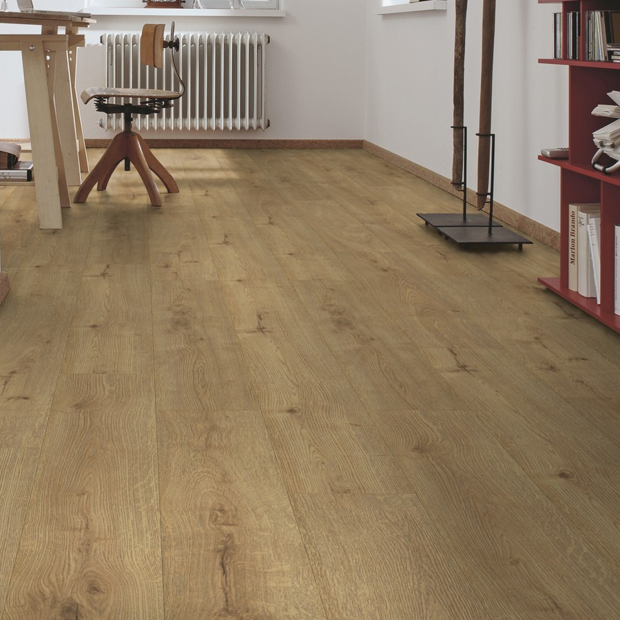 El MeisterDesign. laminate LD 250 en formato compacto de tablón corto (1287 x 220 mm) posee una estructura del producto especialmente alta y estable; además, con su categoría de utilización 23 | 32, también es apropiado para múltiples áreas directas. El LD 250 está equipado con una impregnación de bordes AquaStop y una capa media AquaSafe+ que lo hacen resistente al agua (24 h según la NALFA (North American Laminate Floor Association)). Por lo tanto, este suelo también puede colocarse en cuartos de baño. La superficie Diamond Pro resistente a los arañazos y el papel decorativo antiestático completan las ventajas técnicas de este suelo.