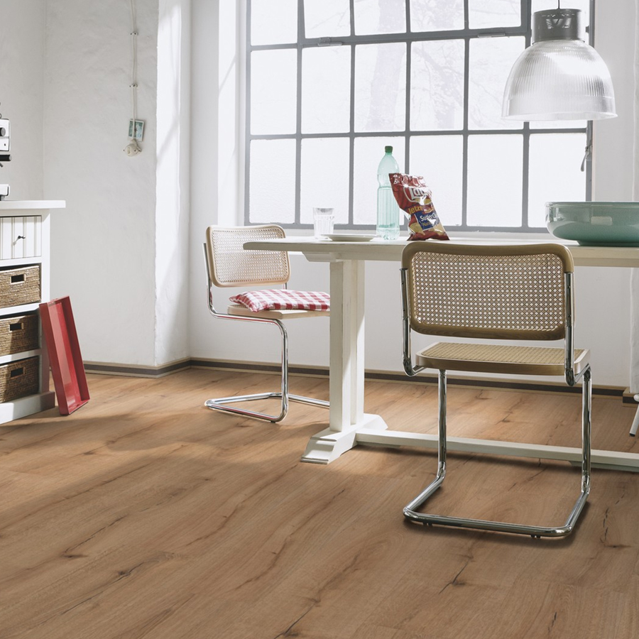 Antiestático, resistente al agua y totalmente resistente a los arañazos: el MeisterDesign. laminate LD 200 es el suelo laminado ancho y inteligente para todas las aplicaciones. Con su altura de montaje de 8 mm y una categoría de utilización 23 | 32, es apropiado para áreas domésticas de uso muy frecuente, como el cuarto de baño, o áreas comerciales (p. ej., tiendas o restaurantes). El tablón corto y ancho (1 288 x 244 mm) tiene un microbisel fino, un detalle visual muy especial que crea un contraste entre los distintos tablones en la superficie y que confiere al suelo una imagen muy plástica y bonita.
