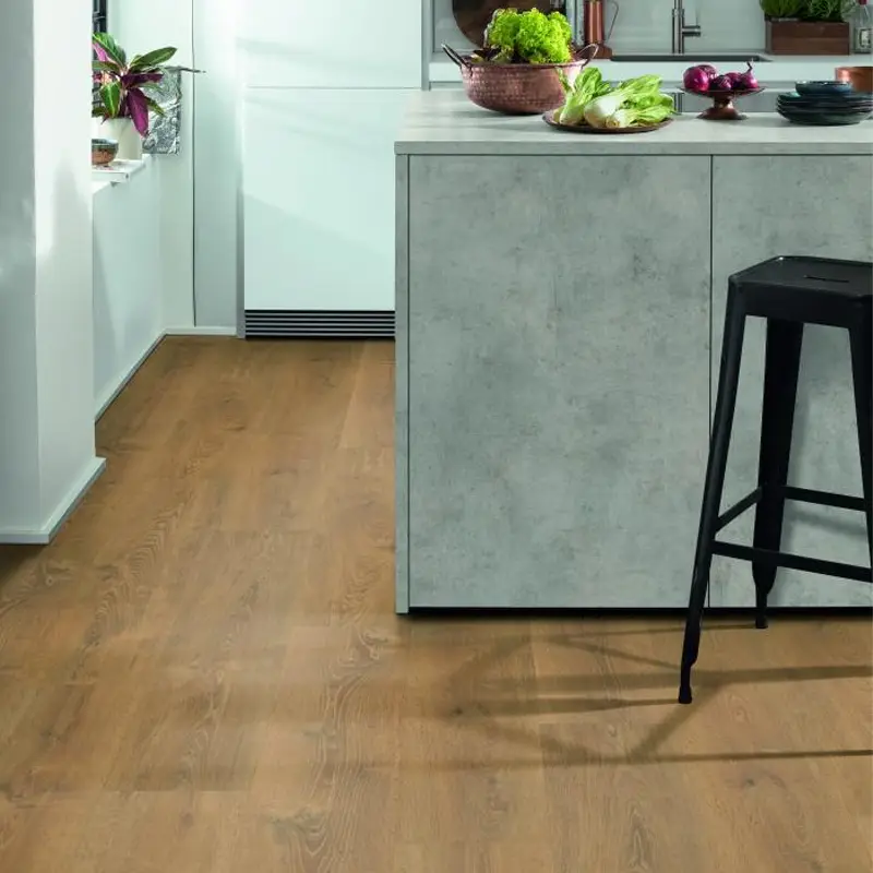 El suelo laminado EEGGER PRO 7,5/33 Aquadura+ Large combina a la perfección diseño y funcionalidad, destacando por su resistencia al agua de hasta 72 horas. Gracias a su innovadora tecnología Aquadura+, este suelo es ideal para áreas con alta exposición a la humedad, como baños y cocinas. Su superficie mate incorpora la tecnología NatureSense Aqua+, que proporciona una apariencia y textura ultra realista, logrando el aspecto auténtico de la madera natural con una sensación táctil sofisticada. Además, cuenta con una capa de desgaste elástica que protege el diseño frente a golpes, arañazos y manchas, asegurando que se mantenga impecable durante más tiempo y facilitando su limpieza. Incorpora también el sistema Aqua CLIC it en los biseles de perfil, lo que garantiza una protección fiable contra la humedad infiltrada, además de permitir una instalación sencilla y segura. La base aislante, fabricada con fibras de celulosa recicladas, no solo mejora el aislamiento acústico y térmico, sino que lo hace de manera completamente sostenible, contribuyendo al cuidado del medio ambiente. Por otro lado, su núcleo de HDF Aqua+ oscuro, sellado especialmente, proporciona la máxima protección contra el hinchamiento, lo que convierte a este producto en la opción perfecta para espacios de alto rendimiento que requieren durabilidad y resistencia.