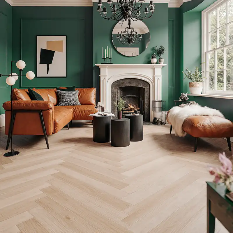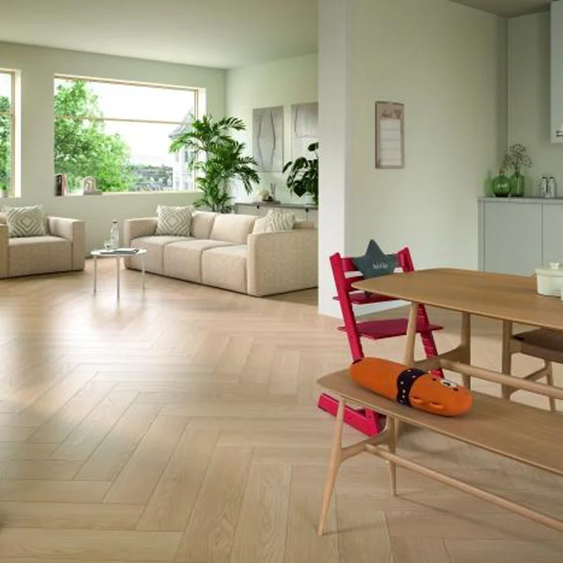 La gama Espiga 8/32 ofrece suelos laminados de alta calidad que combinan diseño moderno y funcionalidad. Como parte de la colección NatureSense, está fabricado a partir de madera como materia prima renovable, brindando una opción sostenible sin comprometer la durabilidad y la estética. Su elegante acabado en patrón espiga no solo aporta un toque sofisticado y atemporal, sino que también se adapta a diferentes estilos de decoración. Además, su superficie resistente a la luz, los arañazos y los impactos asegura un resultado duradero y funcional, ideal para el día a día. La instalación es sencilla gracias a los sistemas de clic patentados por EGGER, haciendo de este suelo una opción práctica para cualquier espacio residencial.