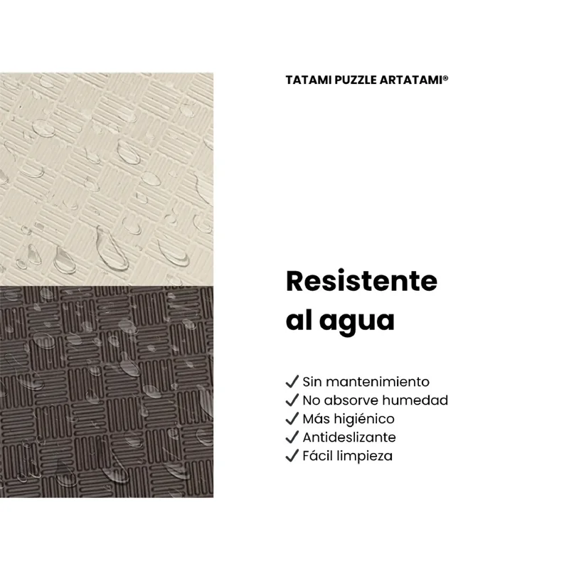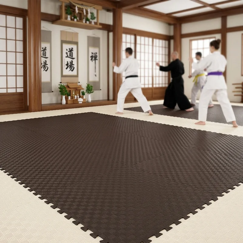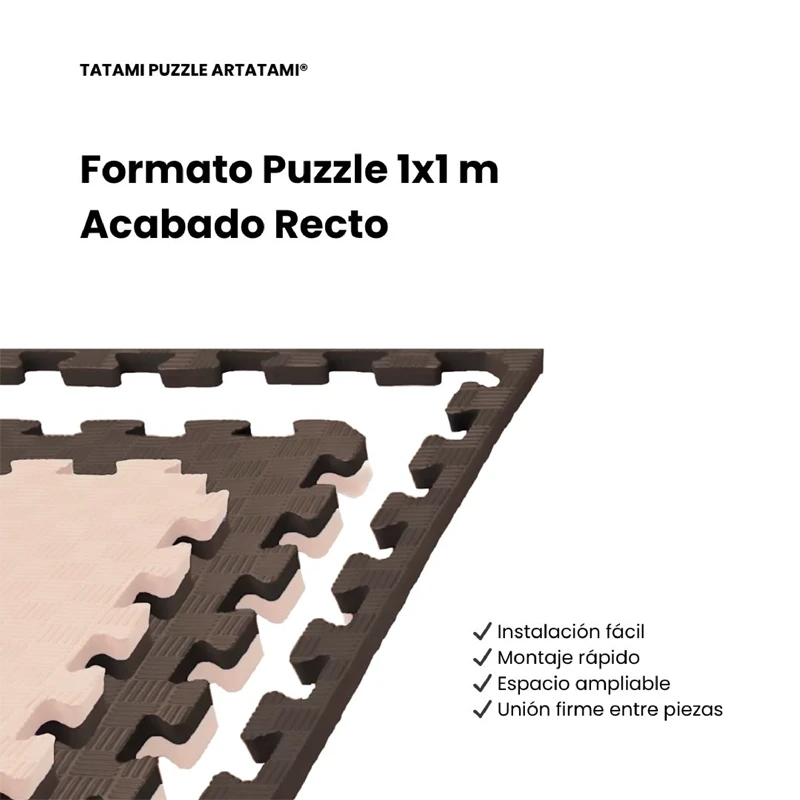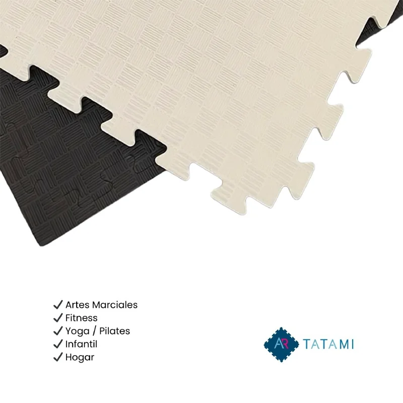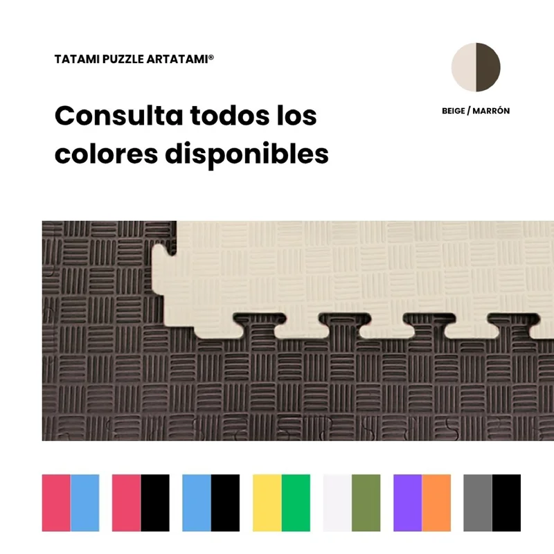 Artatami®. El color de las Losetas de tatami Puzzle marrón/ Beige responde a razones prácticas y filosóficas. Las artes marciales tienen raíces ancestrales de conexión con la naturaleza, el marrón alaba la tierr Artatami®. El color de las Losetas de tatami Puzzle marrón/ Beige responde a razones prácticas y filosóficas. Las artes marciales tienen raíces ancestrales de conexión con la naturaleza, el marrón alaba la tierra, la madera, la naturaleza. la Baldosa beige consigue que el tatami aporte calidad y bienestar a los dojo y gimnasios. Juntos crean un espacio de entrenamiento sobrio,calido, de mayor concentración y disciplina para los entrenamientos de cualquier deporte de contacto, Lucha, boxeo, karate,judo, jujutsu, Kendo etc El formato tatamis Puzzle es ideal para la suciedad, siendo el más discreto ante las huellas, pisadas, sudor o pequeñas manchas cotidianas.El suelo de ArTatami es una opción fácil para la realización de ejercicios como yoga, karate, yudo, y demás deportes de contacto esta disponible en un grosor de 20mm, 26mm y 40mm. Disfruta del mejor precio del mercado de tu suelo de Tatami. ¡No lo dejes escapar!