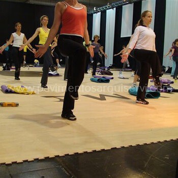Arquisport Aerobic X es la mejor solución para las salas de aerobic y las clases colectivas de usos múltiples, donde se muevan accesorios. Se presenta en losetas de 100x100cm, y 12mm de grosor. Está testado científicamente como el suelo que ofrece mayor protección frente a lesiones en las salas de actividades colectivas.