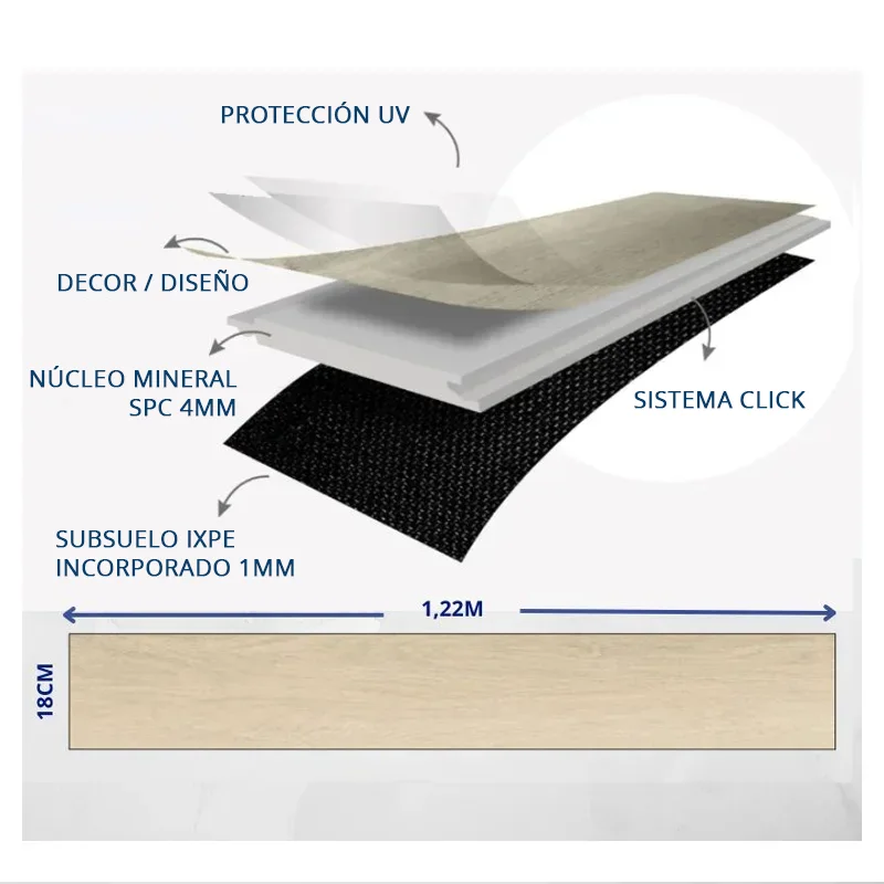 Los suelos Vinílicos SPC han venido para revolucionar el mundo de los suelos flotantes. Esta Tarima SPC ecológica y 100% resistente al agua hace a este modelo exclusivo. Suelos Perfecto para estancias con tránsito intenso y húmedas como cocinas o baños, donde se necesita estabilidad y durabilidad extrema. Habitaciones, salas, oficinas o comercios. Estética y textura impecable. Instalación sín obra, limpia, sín polvo y herramientas. Colocación Flotante con sistema de unión en click entre tablas, fácil y extremadamente rápido. Suelo SPC. 100% Agua impermeable. Ecológico y saludable. Máxima resistencia, arañazos, rayaduras, impactos, desgaste o decoloración. Incorpora técnicamente las últimas tecnologías de los suelos modernos ante las rayaduras, impactos y abrasión o roces, siendo un suelo de tarima vinílica eficaz, cómodo y funcional en el día a día. Uso para tráfico intenso. Hogares, comercios, oficinas y superficies exigentes. Mínima limpieza y sin mantenimiento ¡No te pierdas nuestras ofertas limitadas! ¡Pide tu presupuesto ya!