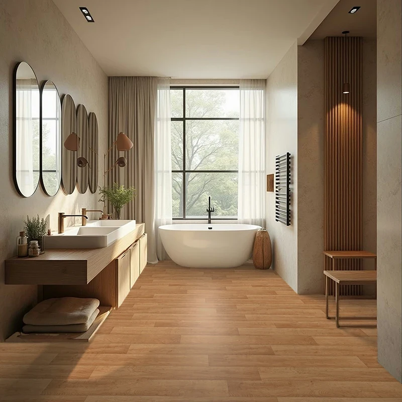 Colección de suelos vinílicos en acabados madera y piedra, de diversos espesores. Disponibles por metros y con 5 años de garantía.
