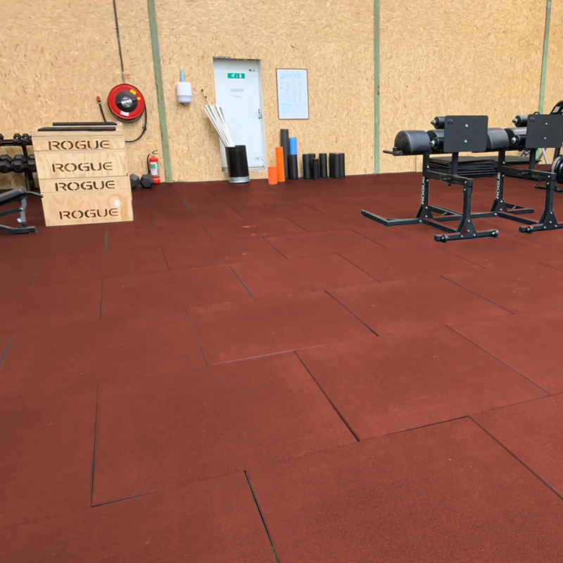 - - Losetas de caucho: Las losetas de caucho son una opción versátil y económica para gimnasios. Se pueden encontrar en una variedad de colores y grosores, y son fáciles de instalar. Simplemente asegúrate de que las losetas estén juntas, puedes utilizar pegamento o anclajes para asegurar su fijación, pero por norma general, el peso de las propias baldosas de caucho es suficiente para mantenerlas fijas.